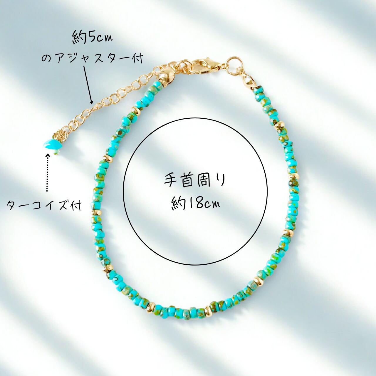 1つ1つ複雑な色合いの天然ターコイズの間にゴールドのビーズでアクセントをつけました。